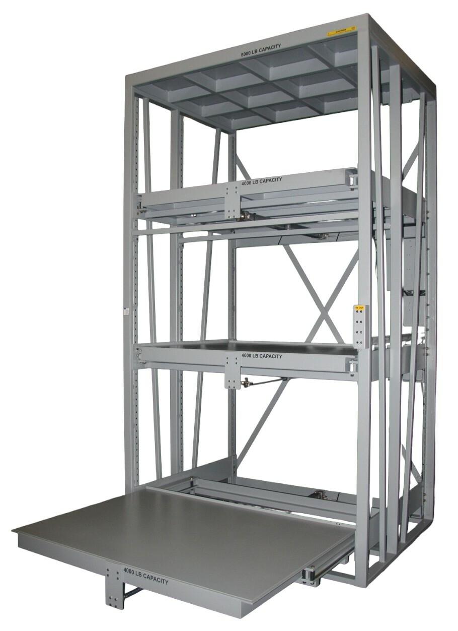 Proper Storage's patented pneumatic roll-out racks are designed to hold up to 4,000 pounds per shelf. Our patented pneumatic units provide a durable, high-capacity vertical storage solution that prioritizes safety and ergonomics, with an efficient overall footprint. Each full-extension shelf is powered by a pneumatic cylinder and can be extended/retracted with the simple push of a button.